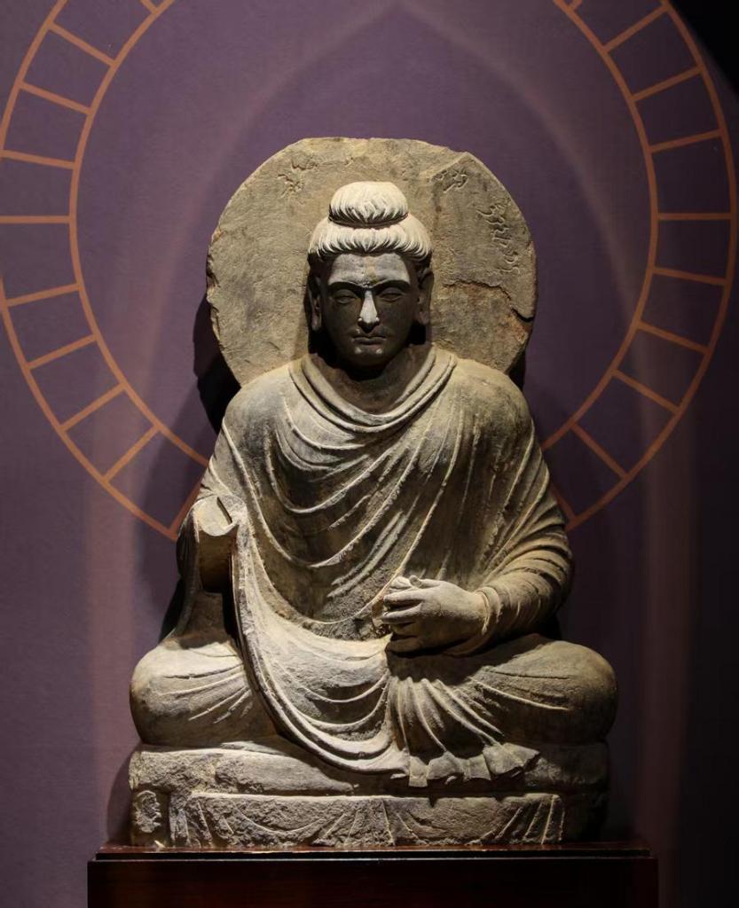 天津博物館「芳香妙相-南京大報恩寺遺跡博物館蔵ガンダーラ造像展」に展示された仏座像。(南京大報恩寺遺跡博物館蔵、天津=新華社配信)