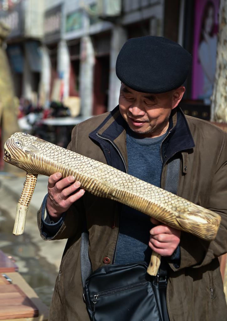 13日、焦岱大集で自作の腰掛けを手に取る地元の職人。(西安=新華社記者/鄒競一)