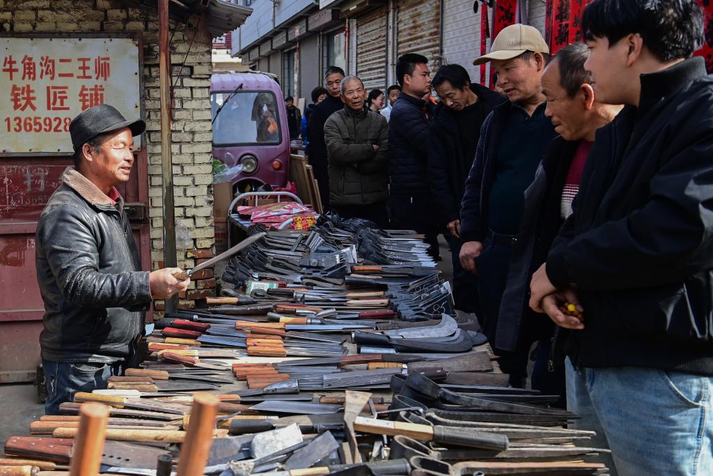 13日、焦岱大集で鉄製品について尋ねる観光客。(西安=新華社記者/鄒競一)