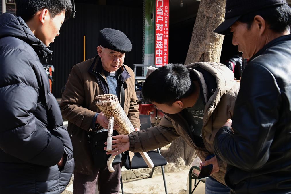 13日、焦岱大集で自作の腰掛けを客に紹介する地元の職人(左から2人目)。 (西安=新華社記者/鄒競一)