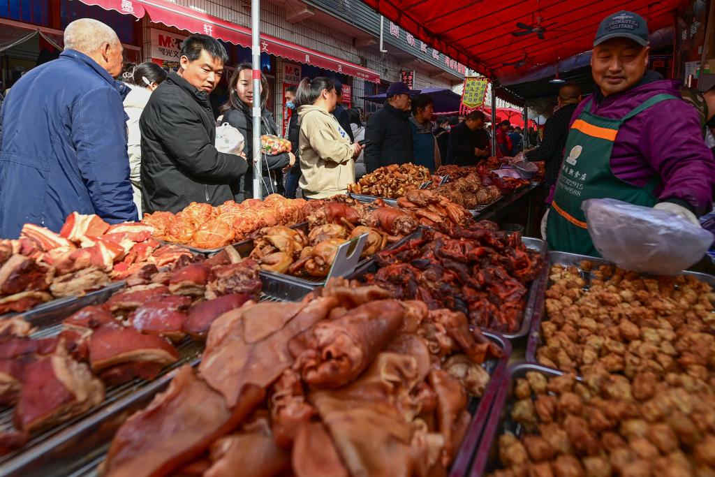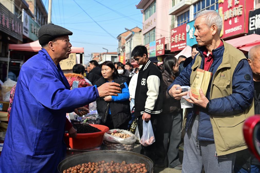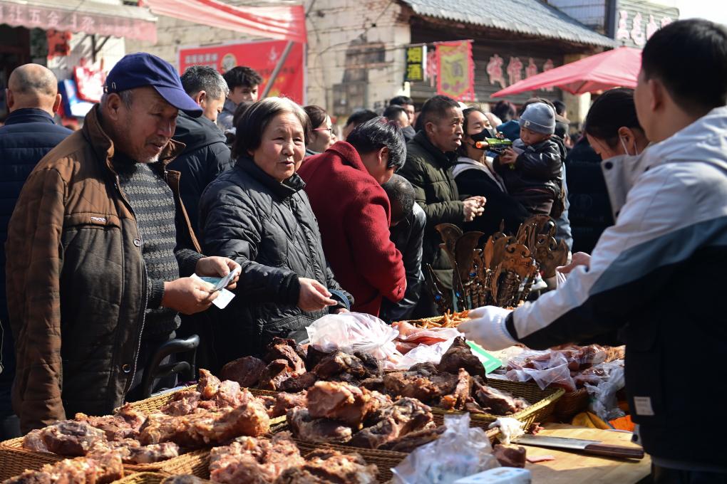 【新華社西安2月15日】中国の秦嶺山脈北麓、陝西省西安市藍田県の焦岱(しょうたい)鎮で開かれる市場「焦岱大集」は、古くから特産品の取引で栄え、県内最大規模の地域市場となっている。現在は山の幸や日用品、農具、家畜、名物料理などを扱う常設と移動式の計1500店余りが並び、活気ある雰囲気が来場者を引き付けている。