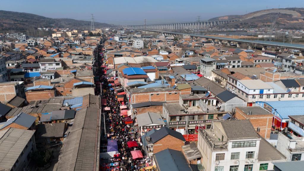13日、買い物客でにぎわう焦岱大集。(ドローンから、西安=新華社記者/鄒競一)