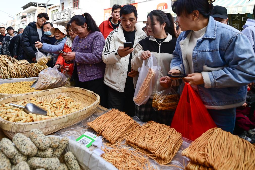 13日、焦岱大集で食品を選ぶ観光客。(西安=新華社記者/鄒競一)
