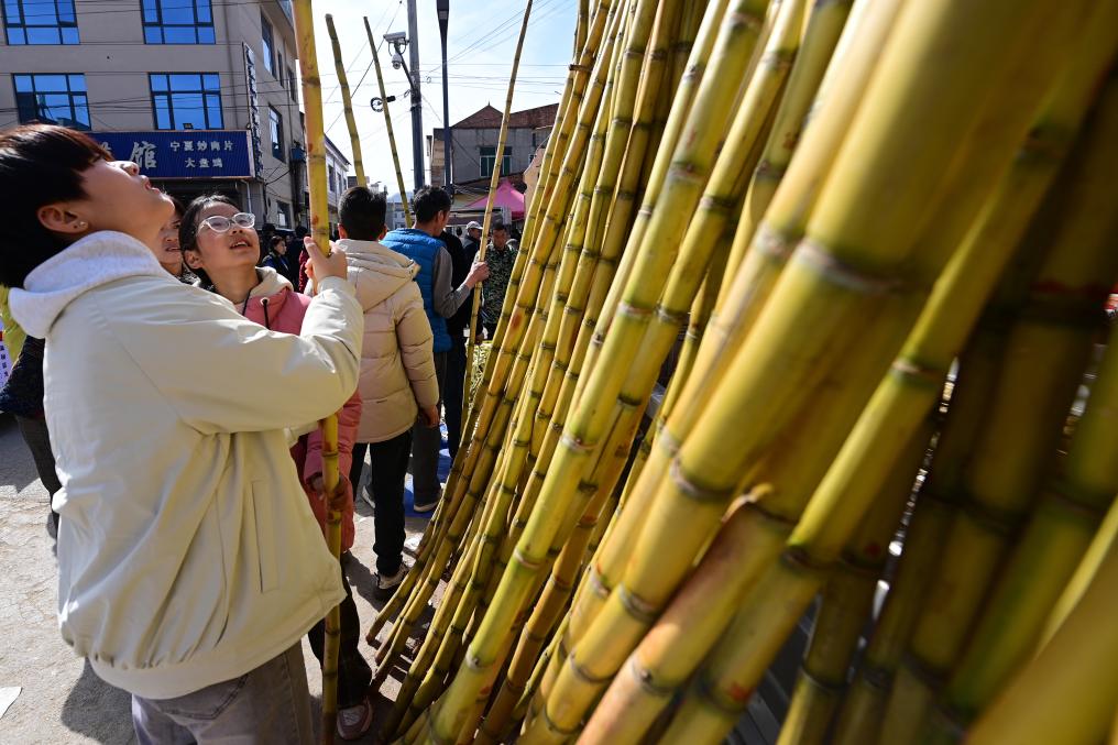 13日、焦岱大集でサトウキビを選ぶ観光客。(西安=新華社記者/鄒競一)