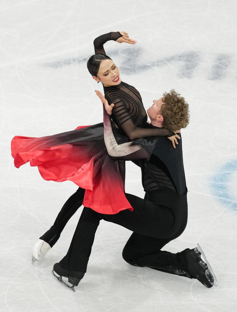 11日、ミラノ・コルティナ冬季五輪フィギュアスケートのアイスダンスで、フリーダンス(FD)の演技に臨むカナダのパイパー・ギレス(左)、ポール・ポワリエ組。総合成績で銅メダルを獲得した。 (ミラノ=新華社記者/陳益宸)