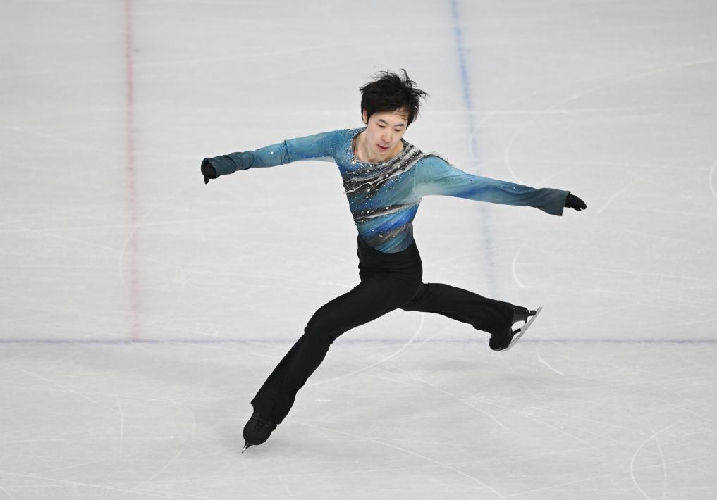 10日、ミラノ・コルティナ冬季五輪フィギュアスケート男子で、ショートプログラム(SP)の演技に臨む中国の金博洋(きん・はくよう)。(ミラノ=新華社記者/李明)