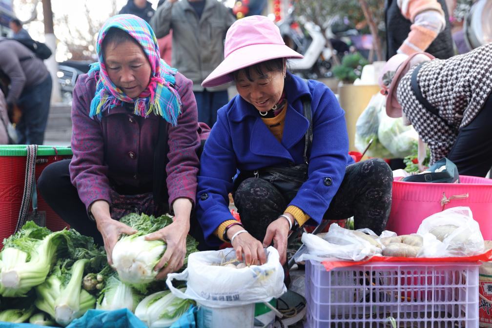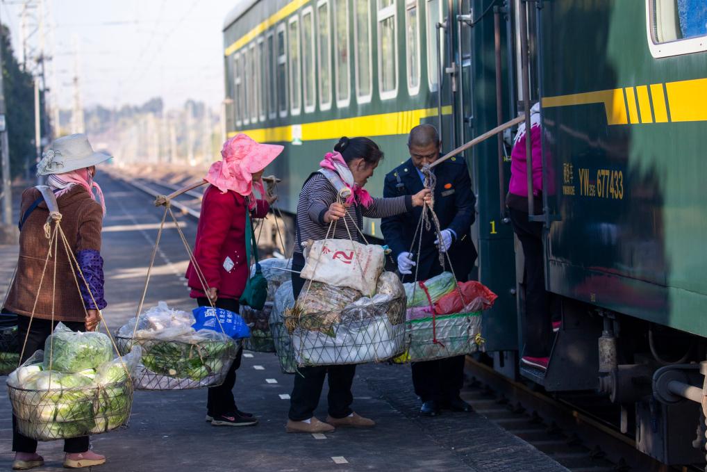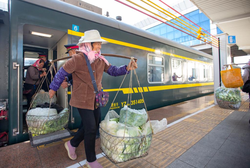 【新華社昆明2月15日】中国雲南省曲靖市の呉官田駅に13日午前、同省昆明市から貴州省の紅果駅に向かう鈍行列車の5652号が到着した。周辺に住む農家の人々は新鮮な青果や特産品を背負って深緑色の車両に乗り込み、曲靖駅で降りて春節(旧正月)用品市場に直行した。