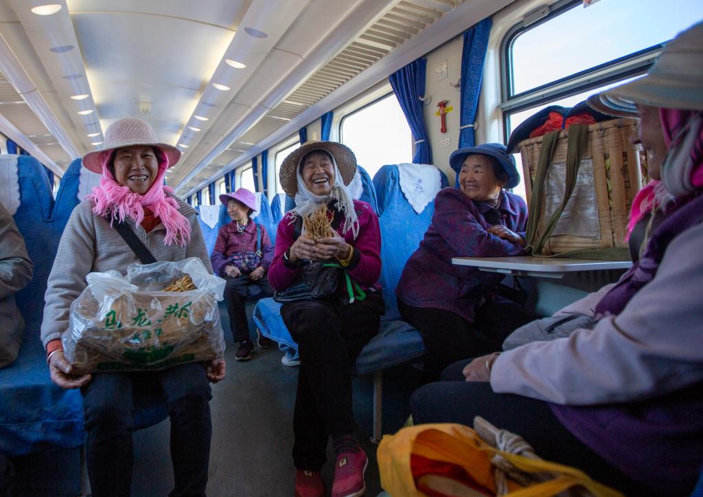 13日、曲靖駅で5652号列車を降りた農家の人たち。(曲靖=新華社配信/楊紫軒)