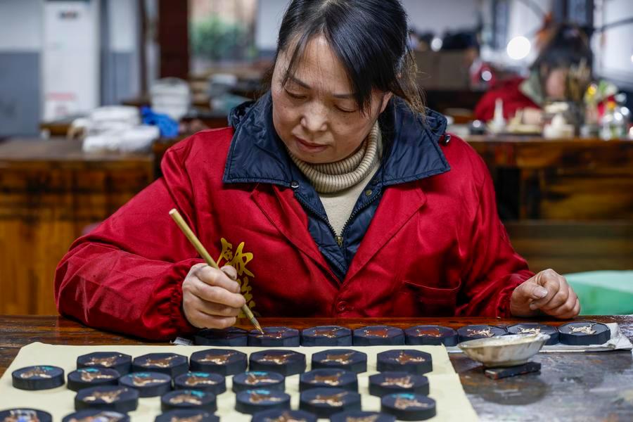老胡開文墨廠で、徽墨に金粉で装飾を施す職人。(1月5日撮影、黄山=新華社記者/周牧)