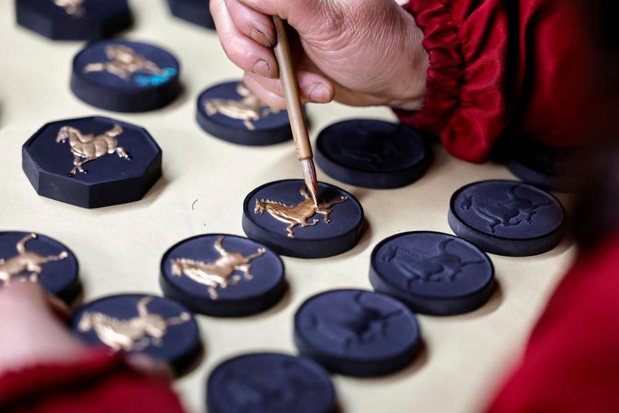 11日、老胡開文墨廠で、金粉の装飾を施される徽墨。(黄山=新華社配信/施亜磊)