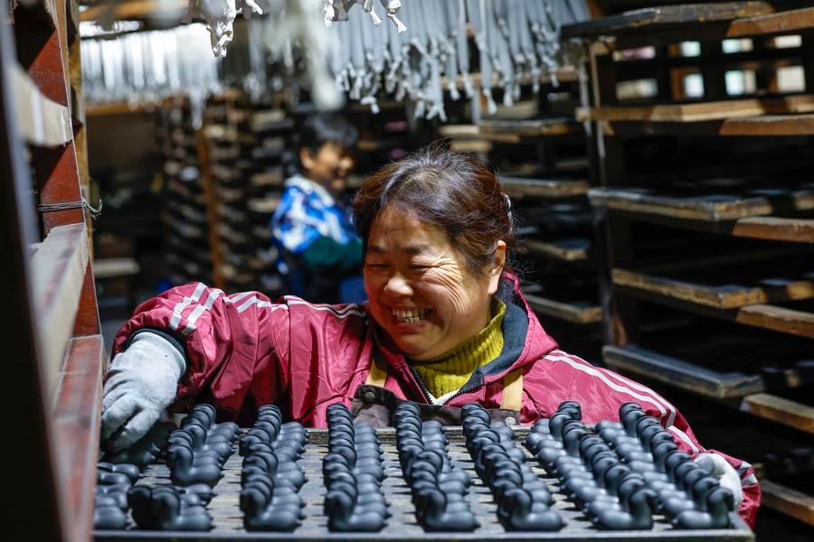 11日、老胡開文墨廠で「立体唐馬墨」を乾燥させる職人。(黄山=新華社配信/施亜磊)