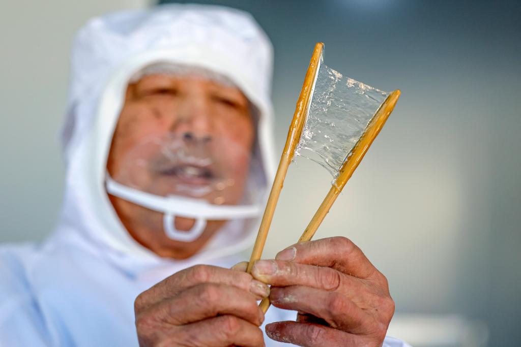 安徽省黄山市祁門県で、麦芽糖シロップの粘度を確認する嵌字豆糖制作技術の代表的伝承者、金恵民(きん・けいみん)さん。(1月13日撮影、黄山=新華社配信/施亜磊)