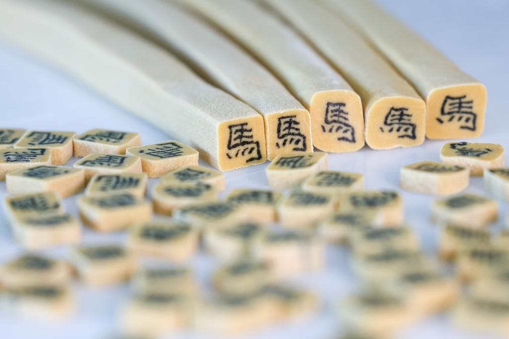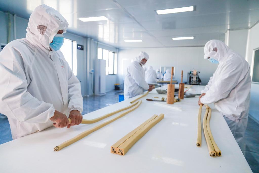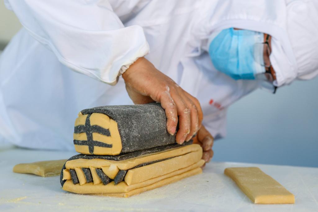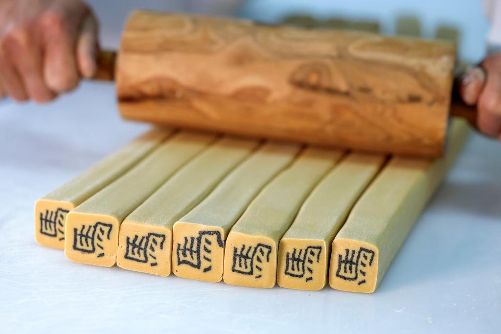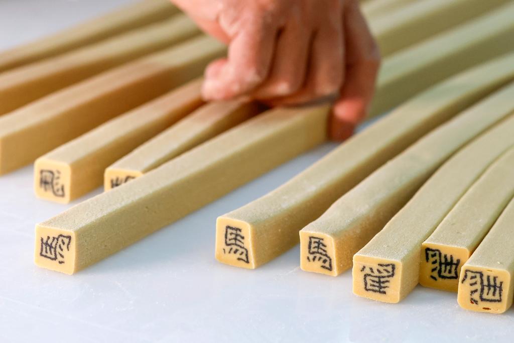 安徽省黄山市祁門県で製作中の「馬」嵌字豆糖。(1月13日撮影、黄山=新華社記者/周牧)