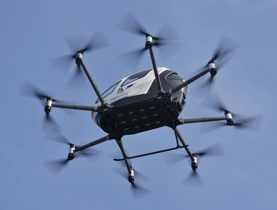 13日、四川省低空経済産業発展の竜志宇董事長を乗せ、空中でホバリングするeVTOL。(成都=新華社記者/劉坤)
