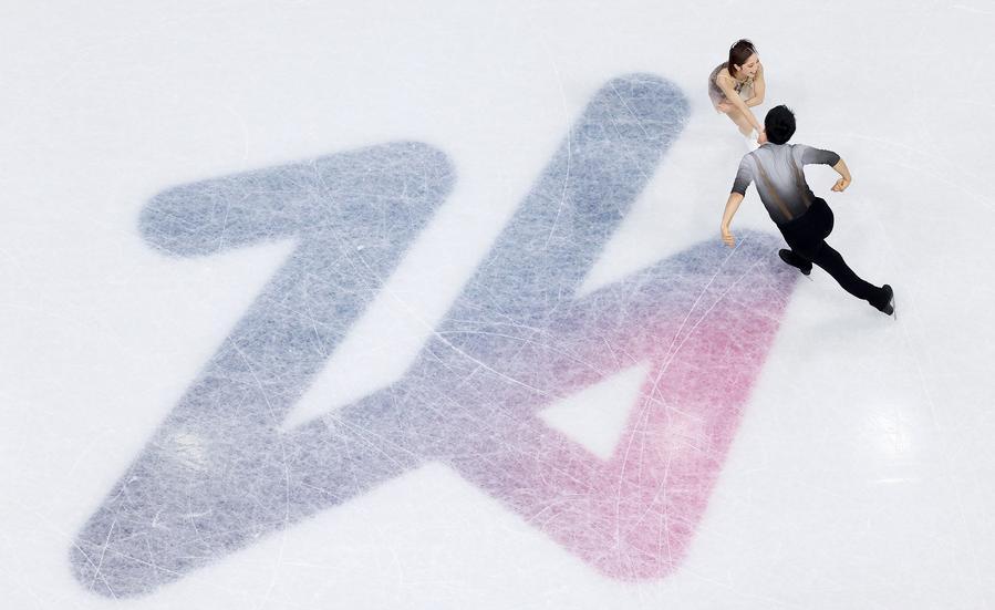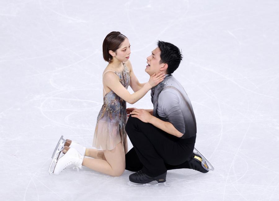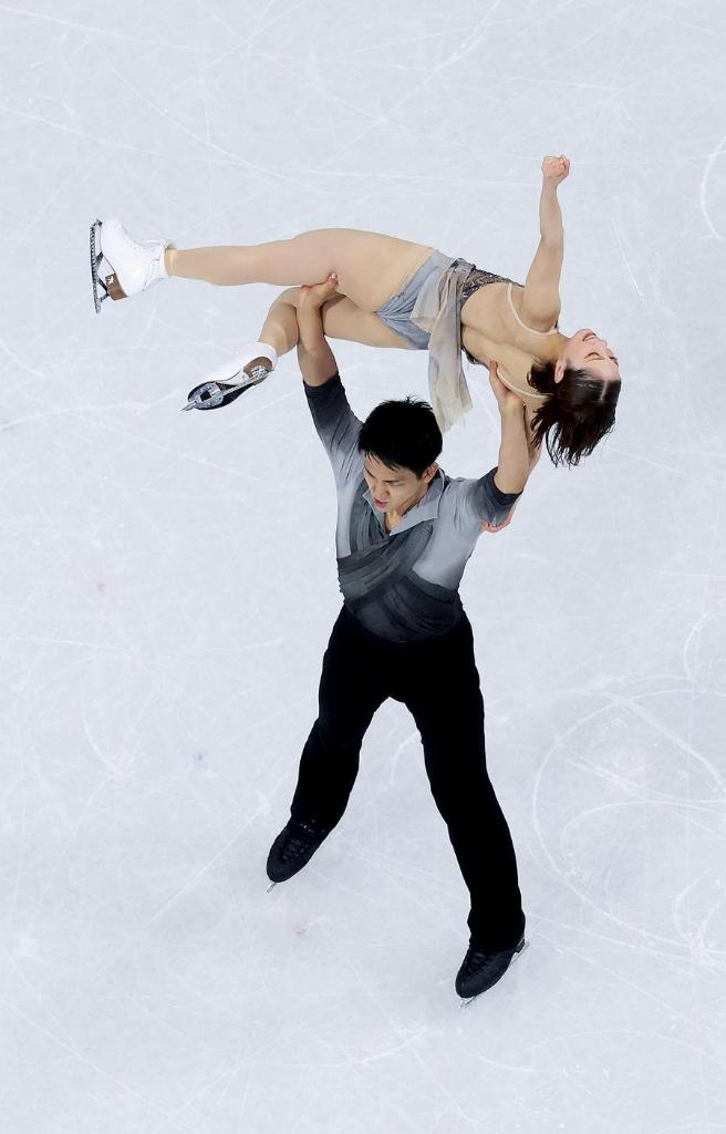 16日、フリーの演技に臨む日本の三浦璃来(上)、木原龍一組。(ミラノ=新華社記者/李明)