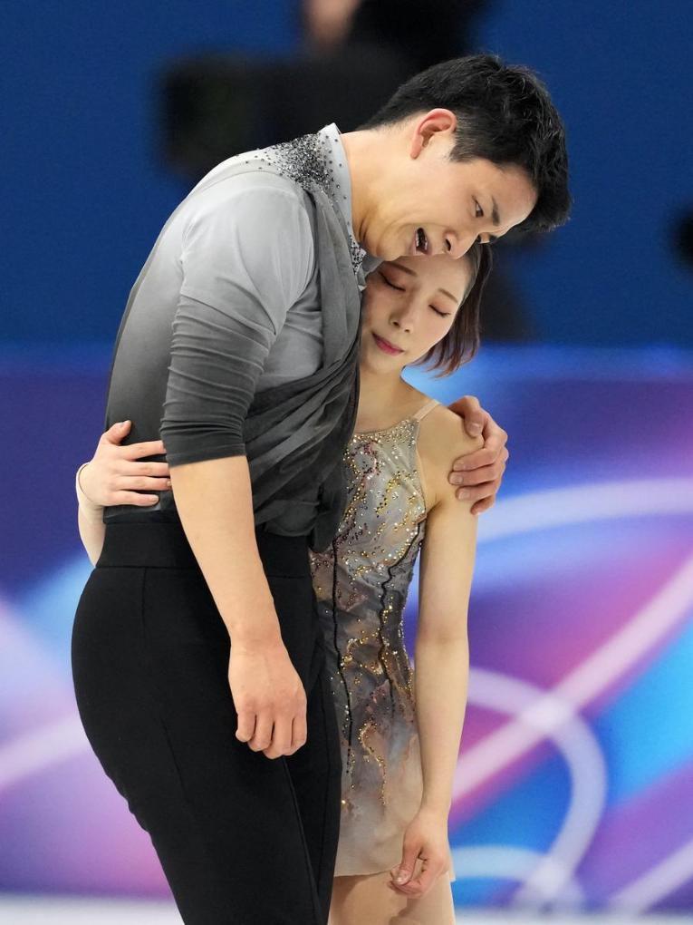 16日、フリーの演技を終えた日本の三浦璃来(左)、木原龍一組。(ミラノ=新華社記者/陳益宸)