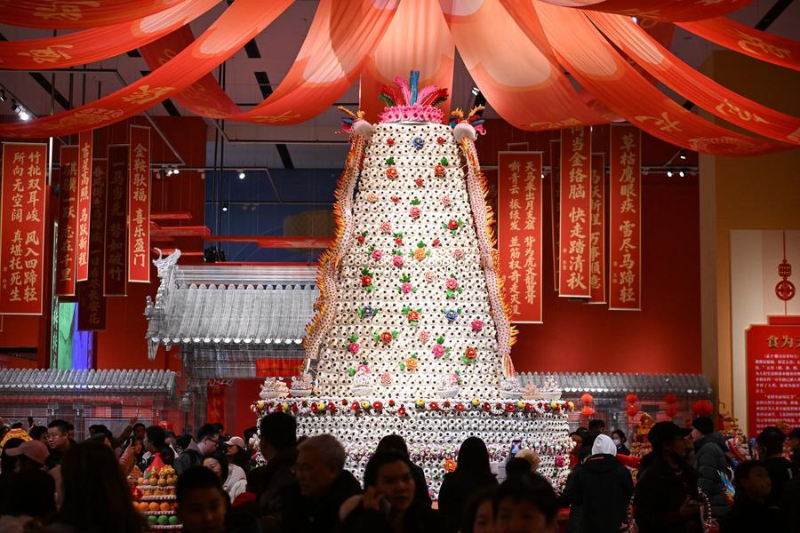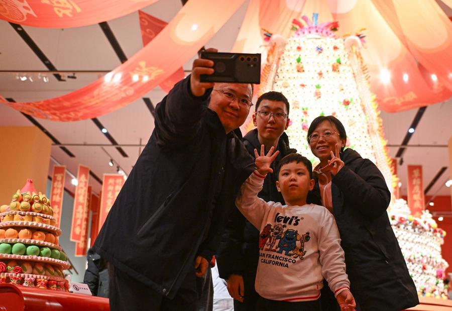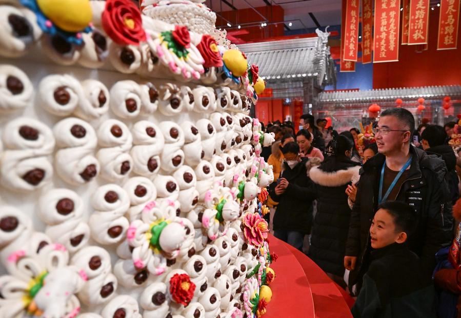 15日、「年越し-丙午春節シリーズテーマ展」で展示された、陝西省の無形文化遺産の代表的項目「澄城面花(飾り蒸しパン)」技術で制作された作品「大鼓棗山」を見る来場者。(北京=新華社記者/陳鍾昊)