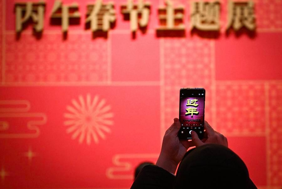 15日、「年越し-丙午春節シリーズテーマ展」で写真撮影を楽しむ来場者。(北京=新華社記者/陳鍾昊)