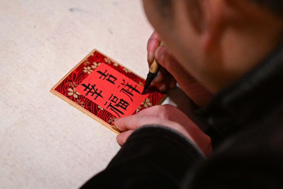 15日、「年越し-丙午春節シリーズテーマ展」で、来場者のために新年を祝う言葉を書く職員。(北京=新華社記者/陳鍾昊)