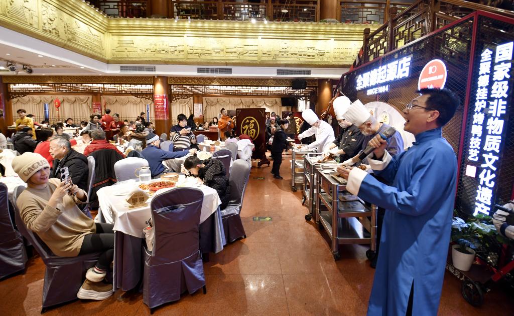 16日、北京市前門歩行街にある北京ダックの老舗「全聚徳」で、年夜飯を食べに来た客に北京ダックの歴史を紹介する店員。(北京=新華社記者/李欣)