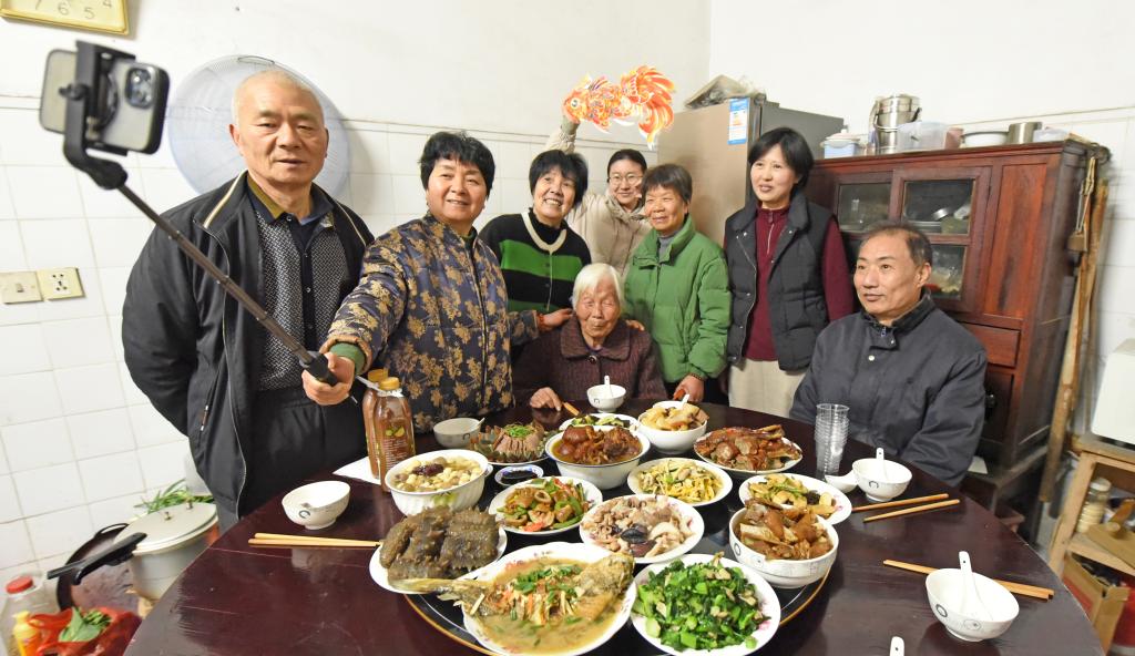 16日、浙江省永康市花街鎮山後胡村で、年夜飯を囲む家族。(永康=新華社配信/胡肖飛)