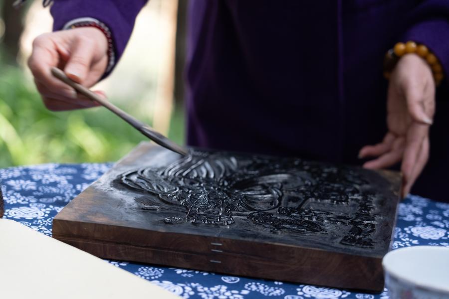 12日、観光客に木版年画の制作手順やこつを実演しながら紹介する羅智婉さん。(綿陽=新華社配信/田海)