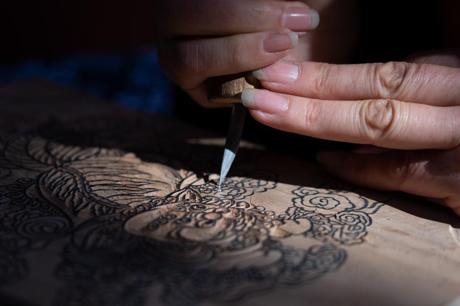 12日、年画の版木を彫る羅智婉さん。(綿陽=新華社配信/田海)