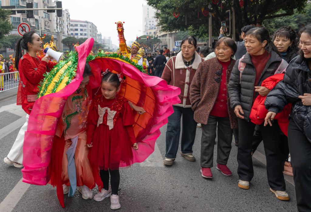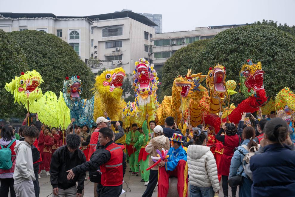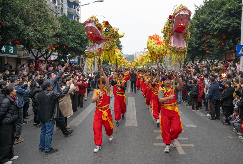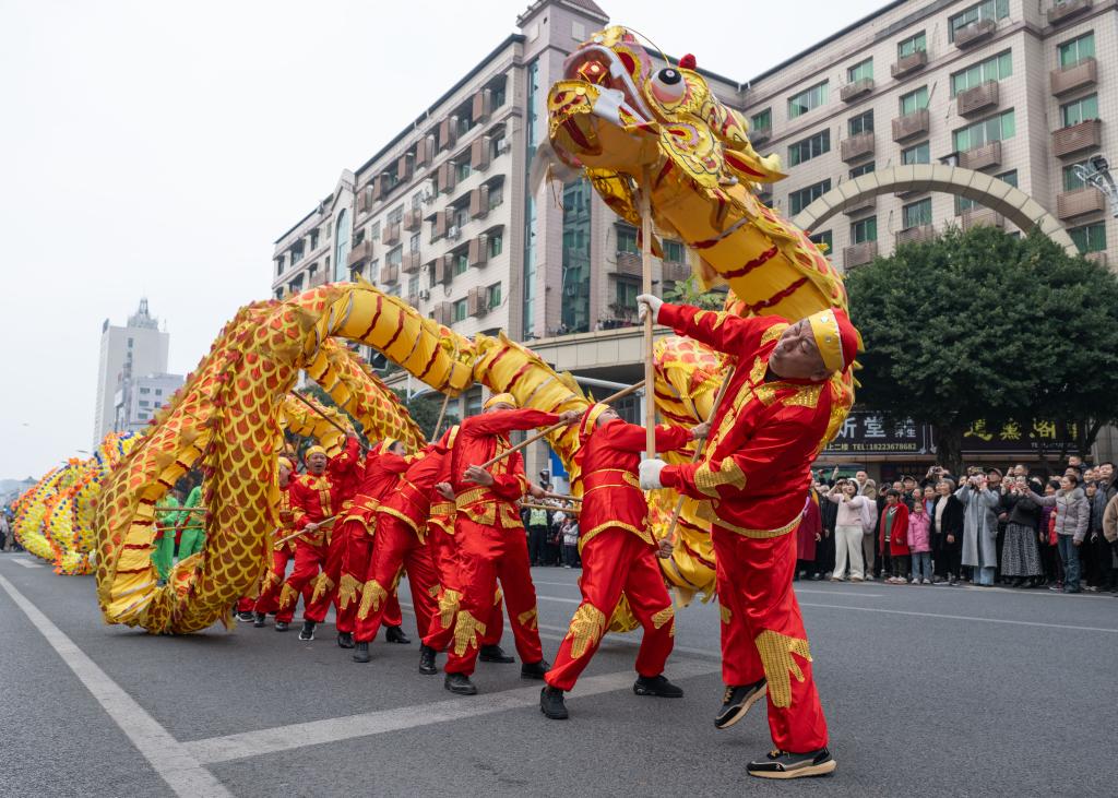 【新華社重慶2月18日】中国重慶市銅梁区で旧暦元日の17日、春節(旧正月)を祝う竜舞のパレードが開幕した。全国各地から12種類、60余りの竜舞チームが集まり、合同で演舞を披露した。催しは正月十五(3月3日)まで続く。