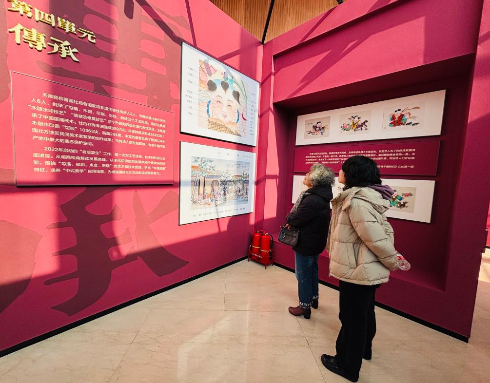 13日、天津博物館「「天津芸術の粋、色彩と造形に宿る魂-楊柳青年画・泥人張彩塑芸術展」で展示を見る人。(天津=新華社記者/周潤健)