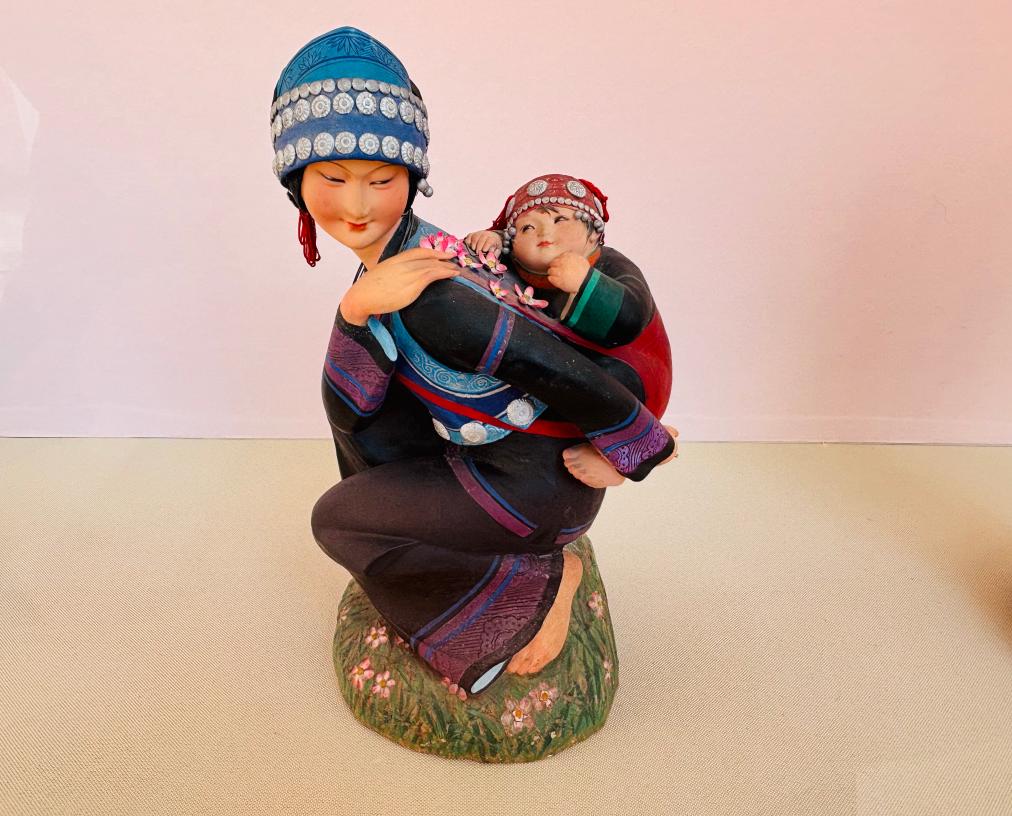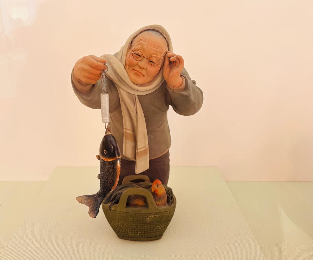13日、天津博物館「「天津芸術の粋、色彩と造形に宿る魂-楊柳青年画・泥人張彩塑芸術展」に展示された泥人張彩塑の作品。(天津=新華社記者/周潤健)