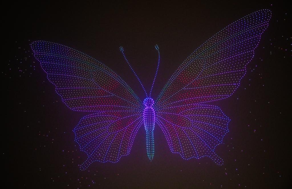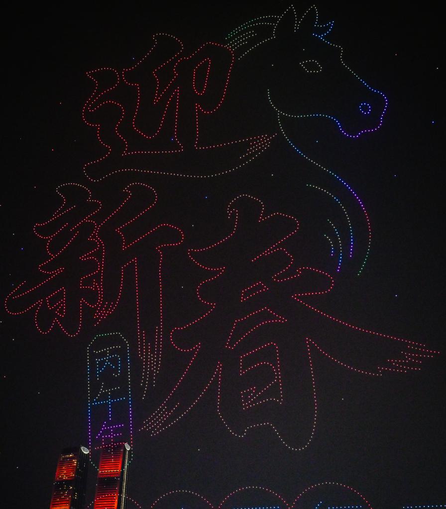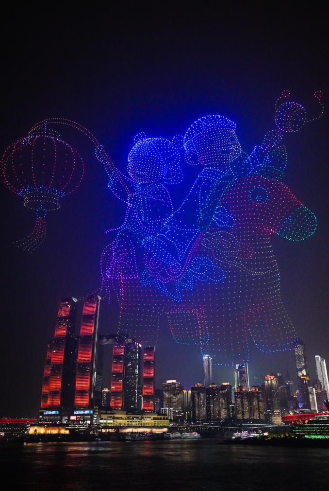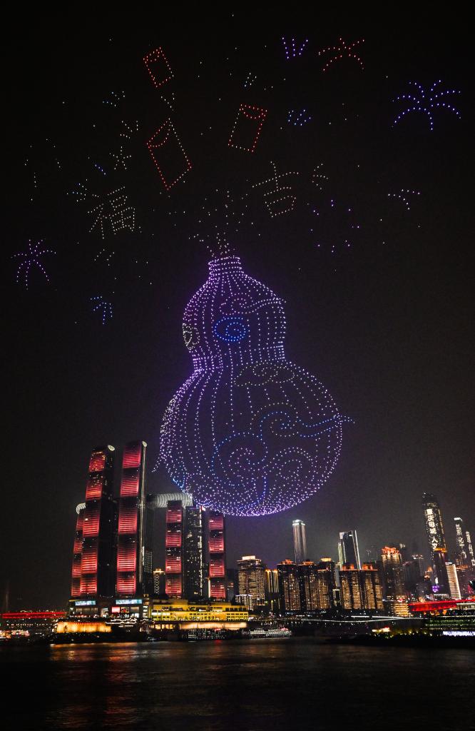 【新華社重慶2月18日】中国重慶市で旧暦元日の17日、ドローンによるライトショーが行われた。編隊を組んだ機体がさまざまな図柄を描き、夜空を鮮やかに彩った。