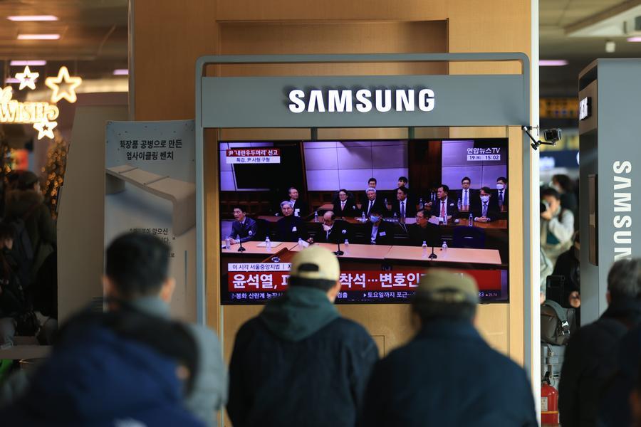 19日、ソウル駅で、尹前大統領の内乱首謀罪の判決を伝えるニュースに見入る人々。(ソウル=新華社配信/朴晋沢)