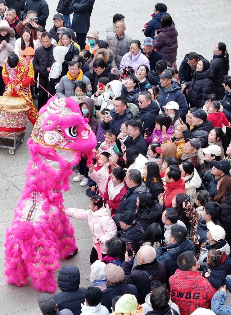 17日、山東省青島市市北区の大鮑島文化観光レジャー街区で獅子舞のパフォーマンスを見る観光客。(青島=新華社記者/李紫恒)