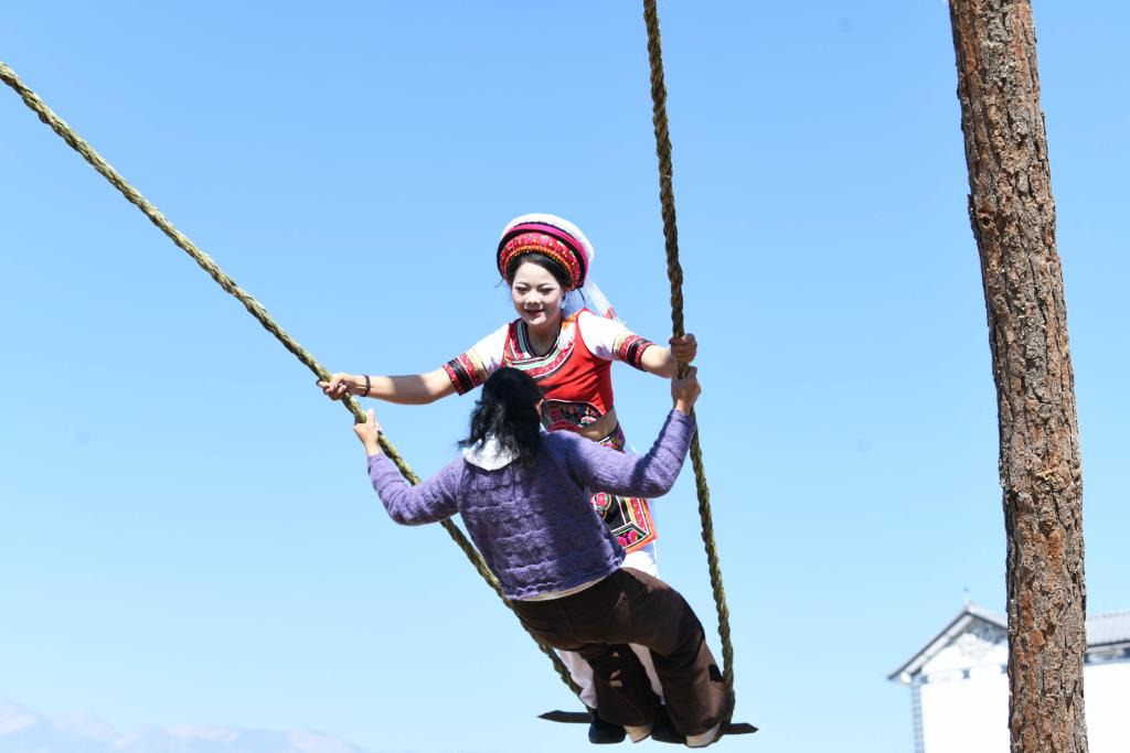 17日、雲南省大理ペー族自治州剣川県馬登鎮文屏村でブランコをこぐペー族の村民。(大理=新華社配信/趙慶祖)