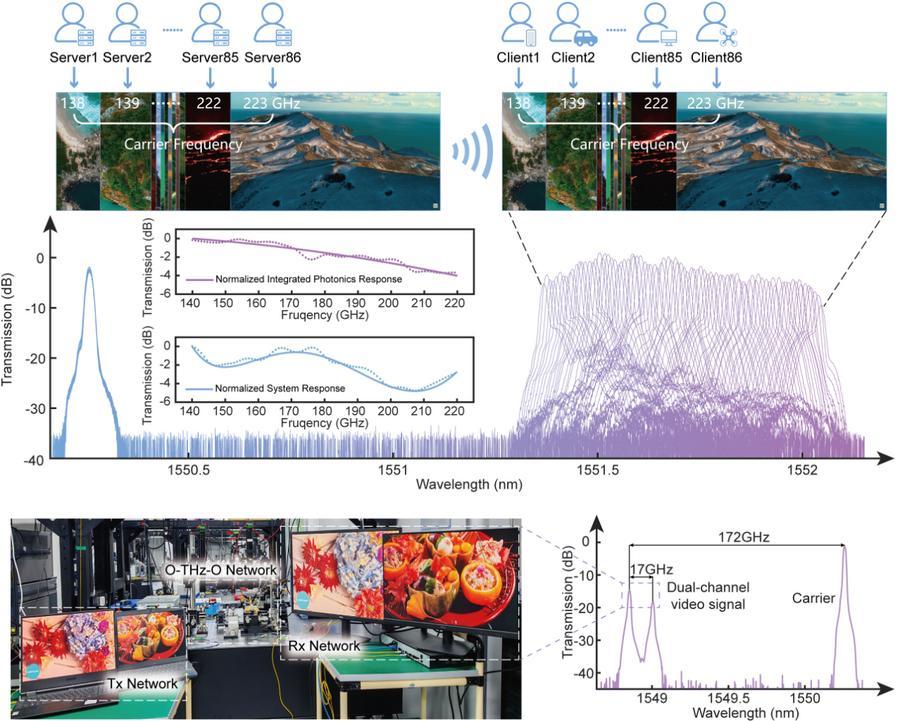 これを受けて、北京大学は鵬城実験室、上海科技大学、国家信息光電子イノベーションセンターなどの研究開発チームと連携し、「光ファイバー・無線一体化融合通信」というコンセプトを打ち出した。さらに、集積光学ソリューションを採用することで、250GHz(ギガヘルツ)以上の超広帯域集積フォトニックデバイスの開発に成功した。これを基盤として開発された新しいシステムは、光ファイバー通信で単一チャンネルあたり512Gbps(ギガビット毎秒)の信号伝送、無線通信において単一チャンネルあたり400Gbpsの信号伝送を実現した。