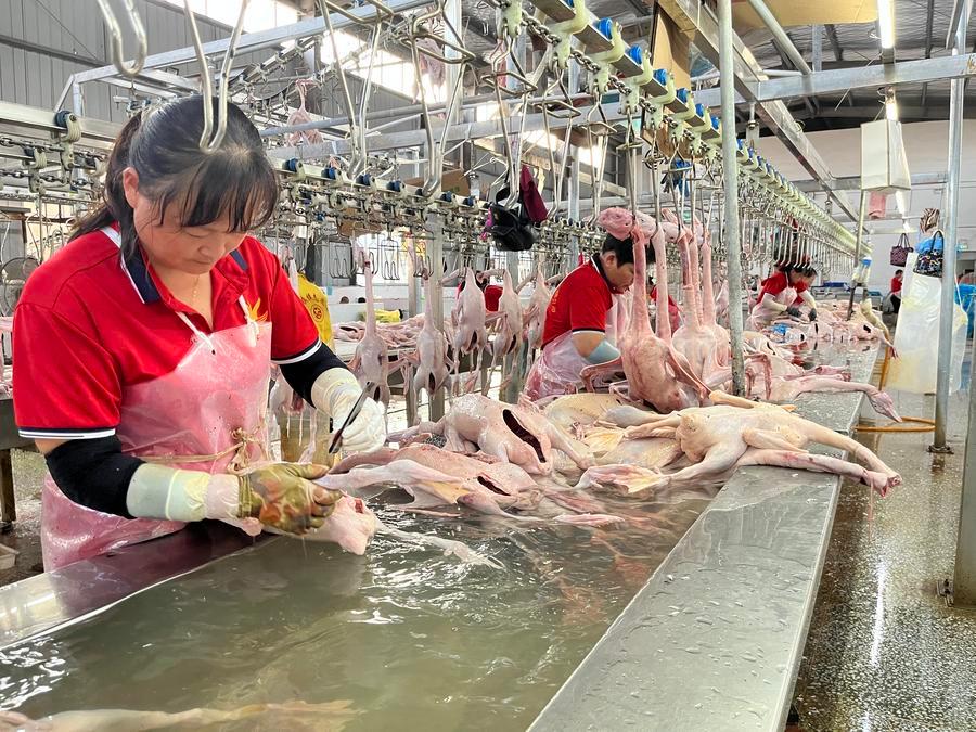 安徽省六安の現代農業産業パークにある、六安市紅新禽羽の生産ライン。(六安=新華社配信/岳陽)