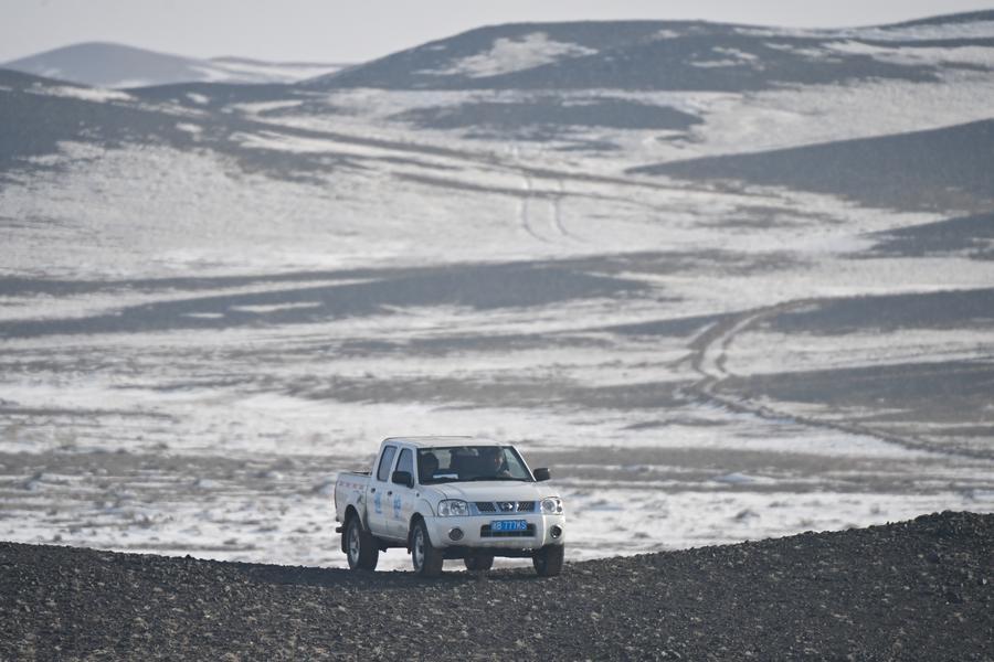 新疆ウイグル自治区のカラマイリ山有蹄類野生動物自然保護区で車を運転してノウマの活動の痕跡を探す管理保護員。(2月4日撮影、ウルムチ=新華社記者/丁磊)