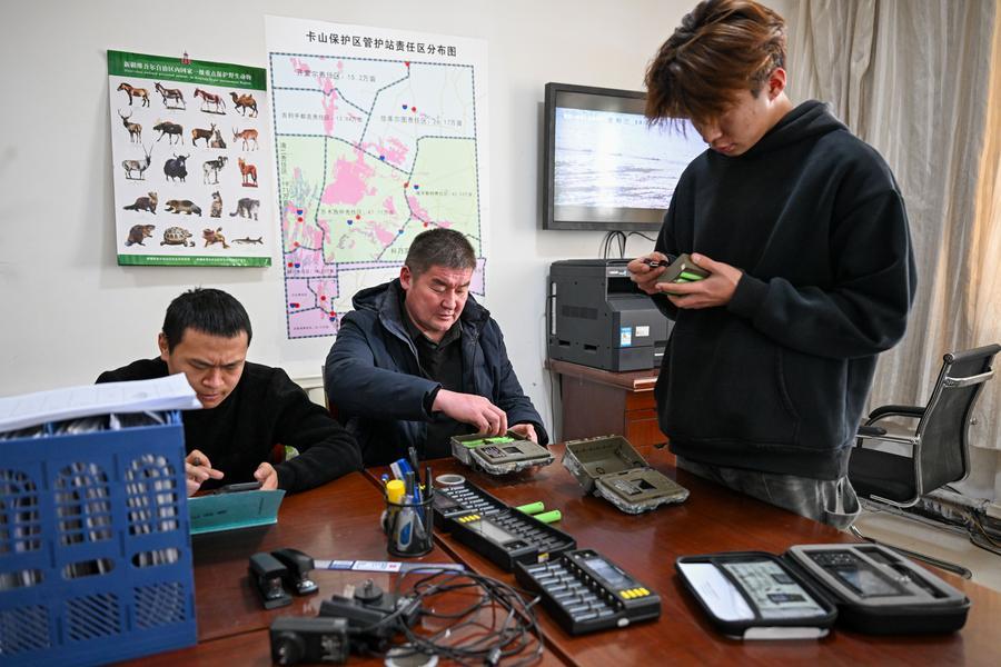 新疆ウイグル自治区のカラマイリ山有蹄類野生動物自然保護区の水源地で赤外線カメラを回収する同保護区管理センターにある、喬木希拝モウコノウマ観測ステーションの管理保護員。(2月4日撮影、ウルムチ=新華社記者/丁磊)