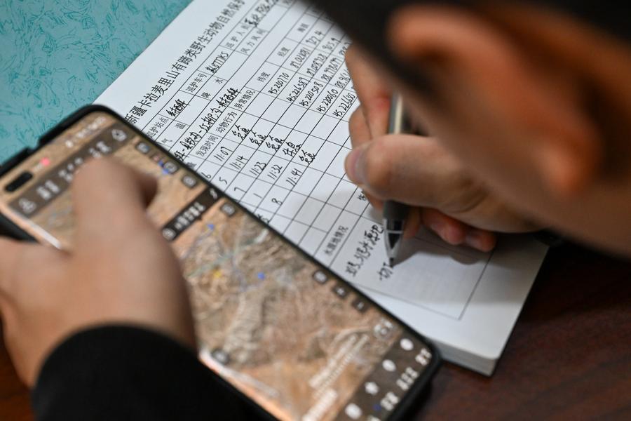 新疆ウイグル自治区のカラマイリ山有蹄類野生動物自然保護区管理センターにある、喬木希拝モウコノウマ観測ステーションで巡視データを記録する管理保護員。(2月4日撮影、ウルムチ=新華社記者/丁磊)