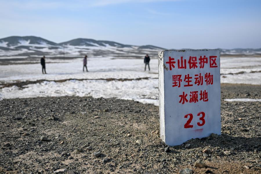 新疆ウイグル自治区のカラマイリ山有蹄類野生動物自然保護区で水源地の結氷状況を確認する、同保護区管理センターにある喬木希拝モウコノウマ観測ステーションの管理保護員。(2月4日撮影、ウルムチ=新華社記者/丁磊)