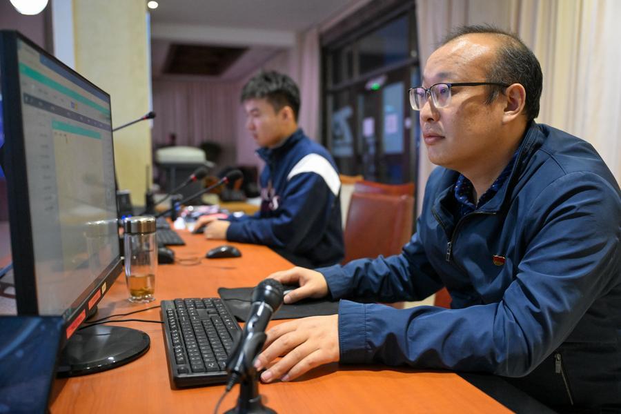 新疆ウイグル自治区のカラマイリ山有蹄類野生動物自然保護区管理センターの指令室で、モウコノウマの観測データを確認する研究者。(2月5日撮影、ウルムチ=新華社記者/丁磊)