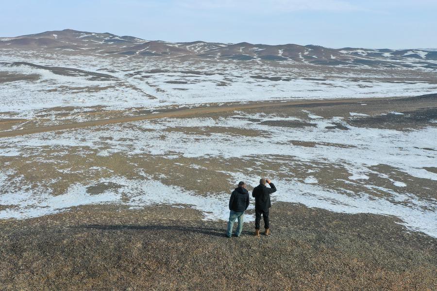新疆ウイグル自治区のカラマイリ山有蹄類野生動物自然保護区でてノウマの痕跡を探す、同保護区管理センターにある、喬木希拝モウコノウマ観測ステーションの管理保護員。(2月4日、ドローンから、ウルムチ=新華社記者/丁磊)