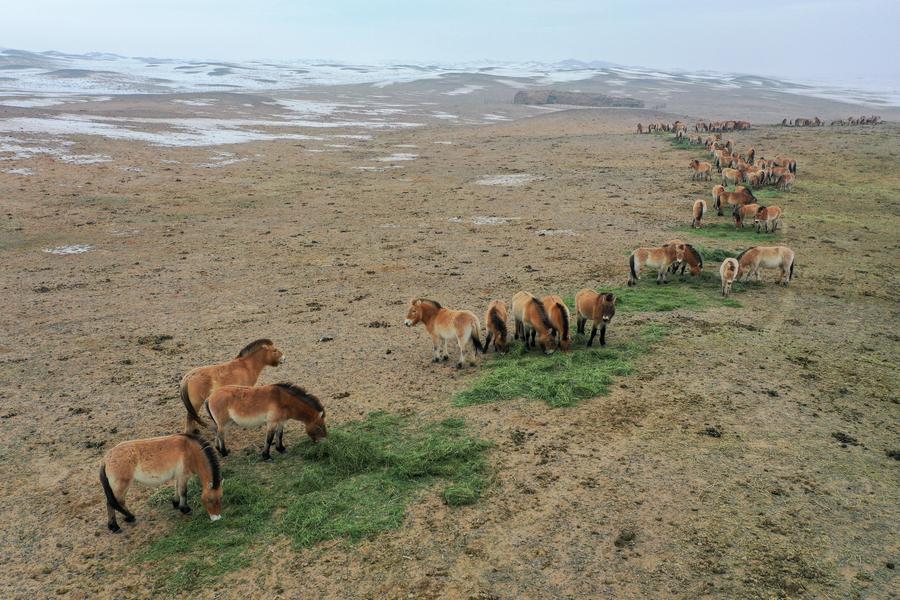 新疆ウイグル自治区のカラマイリ山有蹄類野生動物自然保護区管理センターにある、喬木希拝モウコノウマ観測ステーションに生息するノウマ。(2月4日、ドローンから、ウルムチ=新華社記者/丁磊)