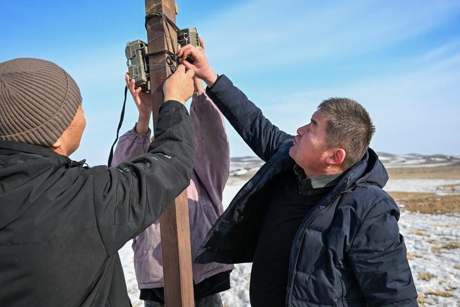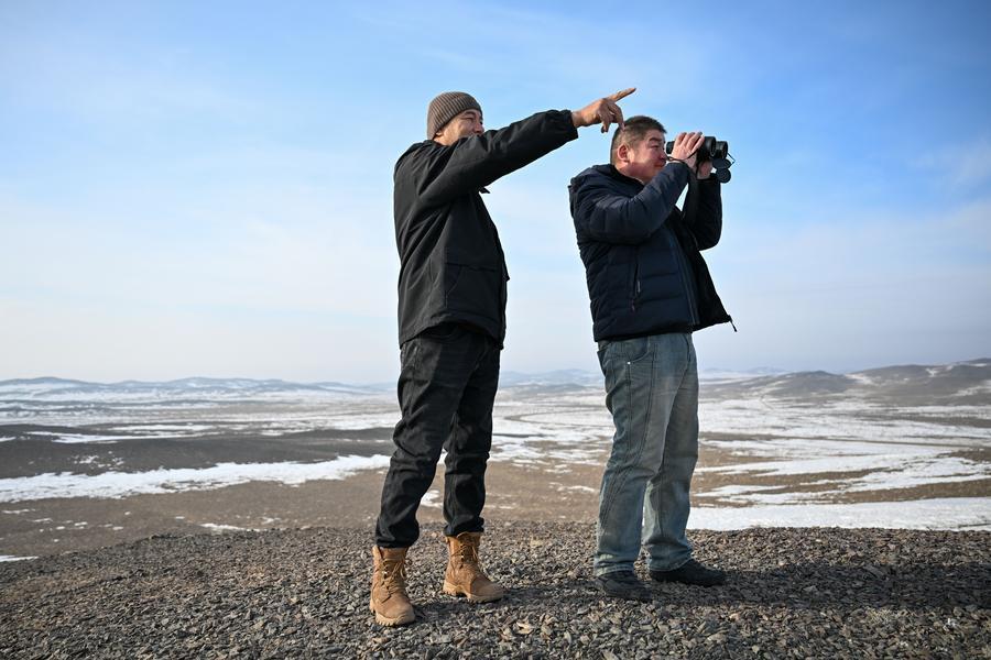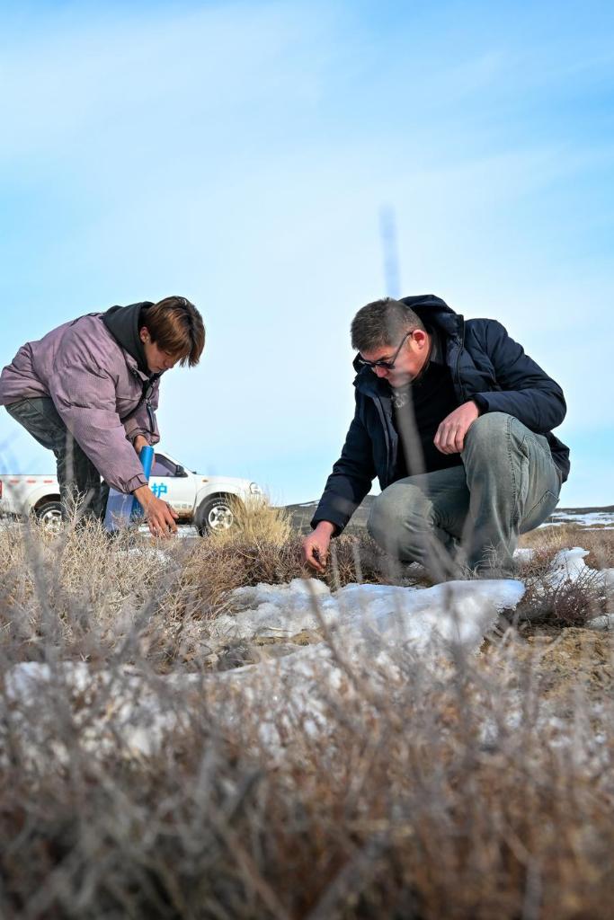 新疆ウイグル自治区のカラマイリ山有蹄類野生動物自然保護区で植生の状況を確認する同保護区管理センターにある、喬木希拝モウコノウマ観測ステーションの管理保護員。(2月4日撮影、ウルムチ=新華社記者/丁磊)