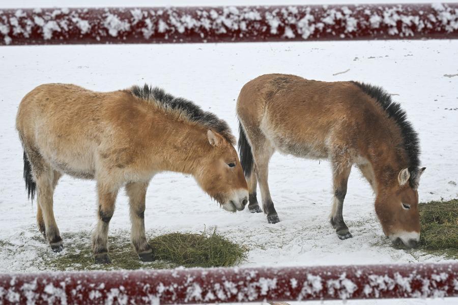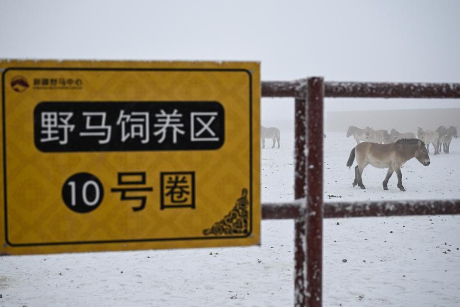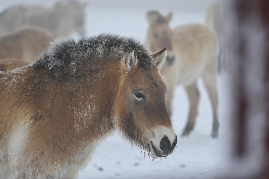 新疆ウイグル自治区のカラマイリ山有蹄類野生動物自然保護区管理センターにある、喬木希拝モウコノウマ観測ステーションに生息するノウマ。(2月4日撮影、ウルムチ=新華社記者/丁磊)