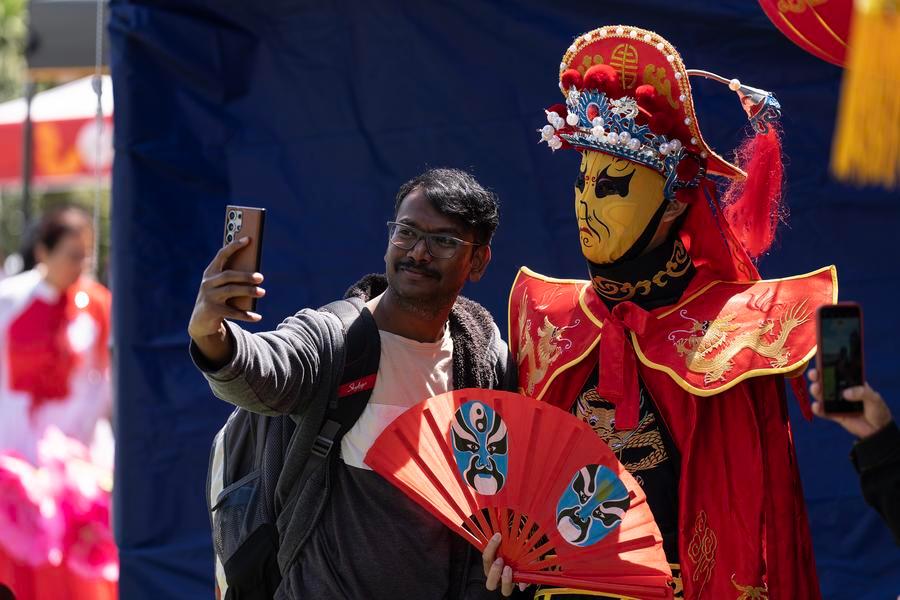 21日、オークランドの新春多文化フェスで、「変臉(へんれん=隈取りの仮面の早変わり)を披露した役者と自撮り写真に納まる男性。(オークランド=新華社配信/呉家翔)