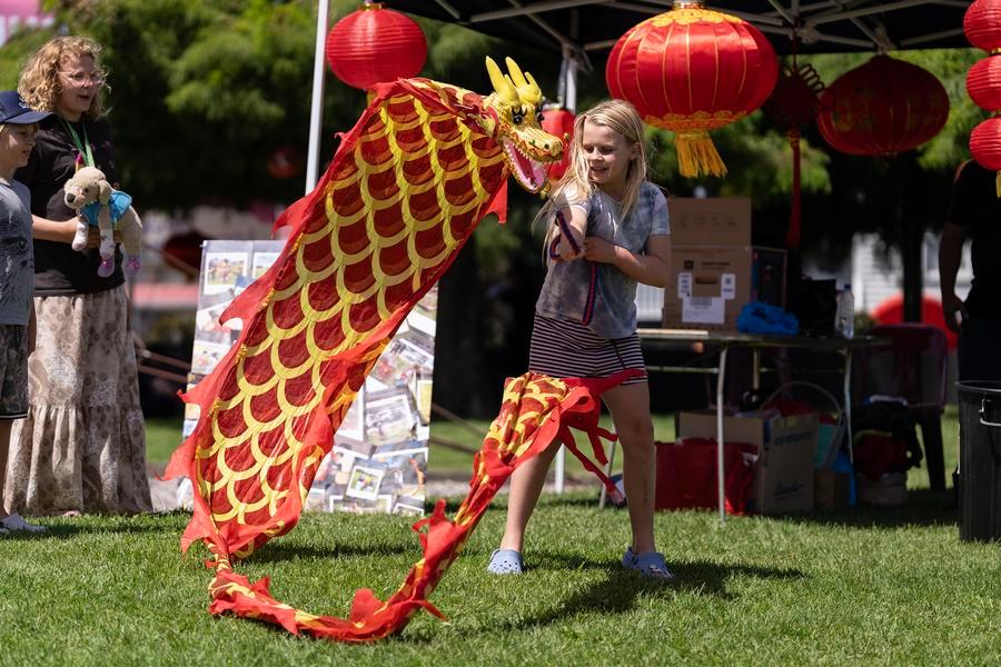 21日、オークランドの新春多文化フェスで竜舞を体験する女の子。(オークランド=新華社配信/呉家翔)