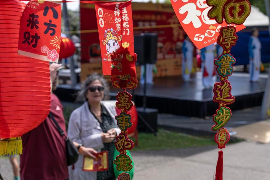 21日、オークランドの新春多文化フェスで、祝福の言葉が添えられた装飾品を眺める来場者。(オークランド=新華社配信/呉家翔)
