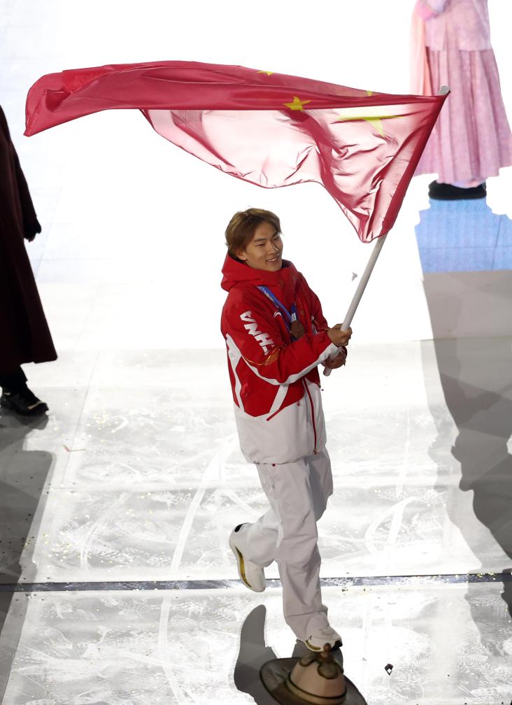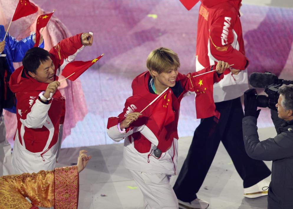 22日、ミラノ・コルティナ冬季五輪の閉会式で中国選手団の旗手を務める蘇翊鳴(そ・よくめい)。(ベローナ=新華社記者/李明)