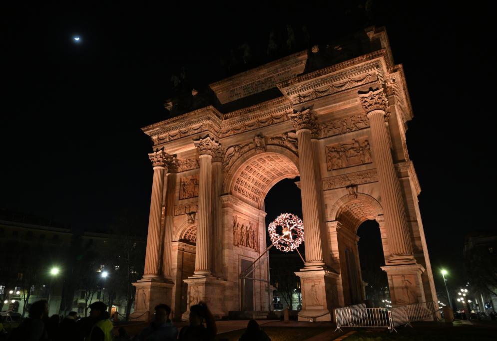 22日、ミラノに設置された聖火台。(ミラノ=新華社記者/武巍)